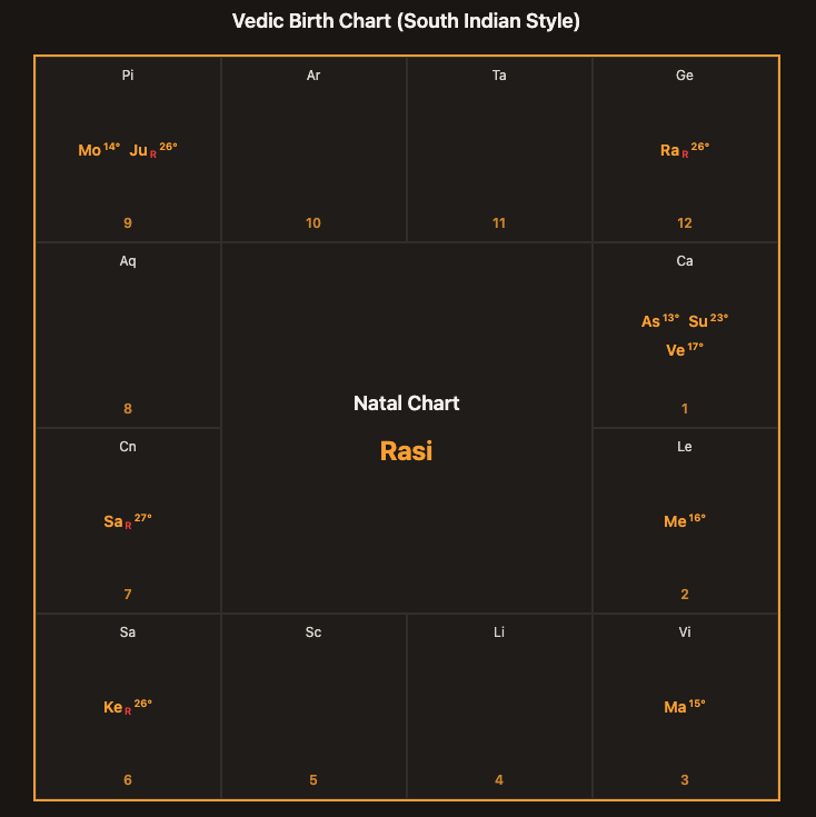 Cancer Ascendant (As) with Sun and Venus in 1st House | Mercury in 2nd (Leo) | Mars in 3rd (Virgo) | Ketu in 6th (Sagittarius) | Saturn in 7th (Capricorn) | Moon and Jupiter in 9th (Pisces) | Rahu in 12th (Gemini)